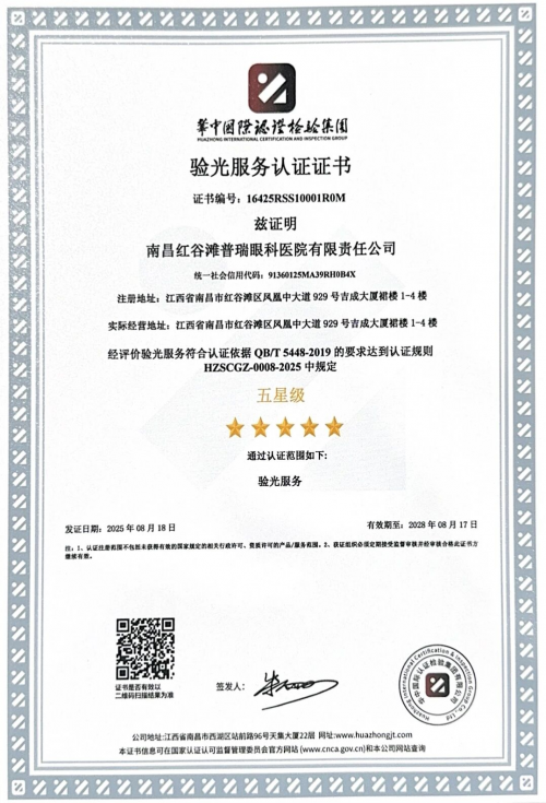 近日,南昌红谷滩普瑞眼科医院凭借卓越的服务品质与专业实力,正式通过国家市场监督管理总局批准的眼科光学验光配镜技术规范的标准认证,成为南昌首家“五星级验光服务认证”机构。这一认证标志着医院在服务标准化、规范化及患者满意度等方面达到行业领先水平,为南昌市眼健康服务树立了全新标杆。